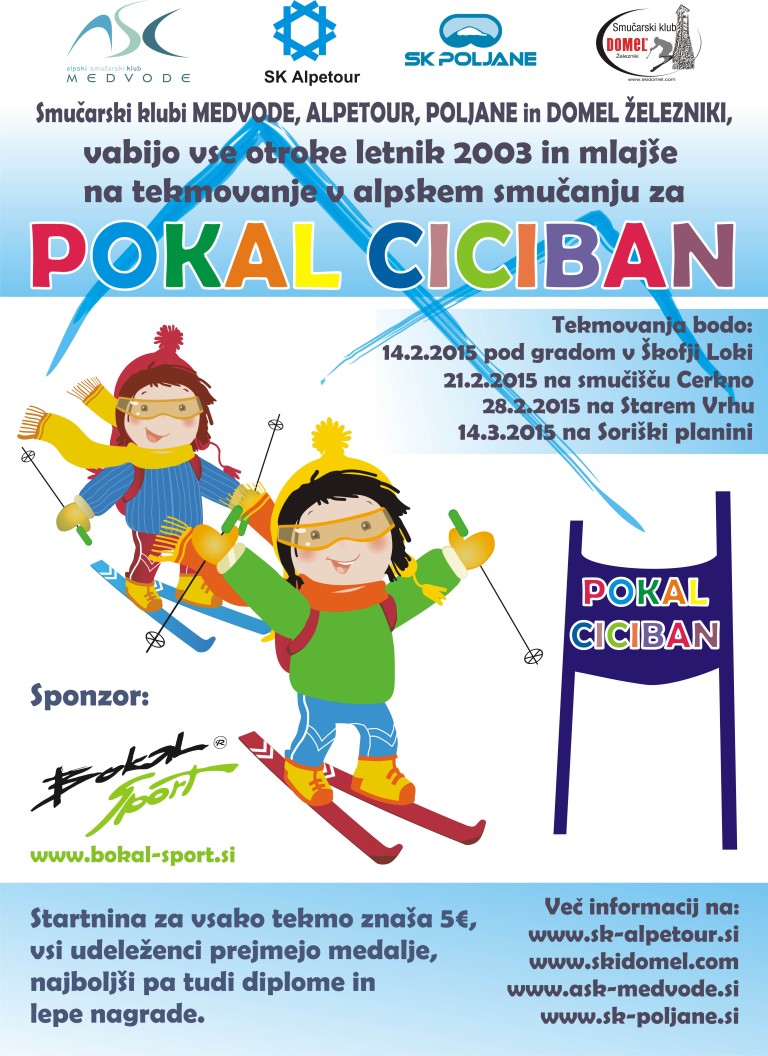 Smučarski klub Domel, Alpetour, Poljane in Medvode ponovno vabijo vse otroke, da se udeležijo spektakularnega otroškega tekmovanja POKAL CICIBAN. Podrobnosti so vidne v priloženem letaku.
